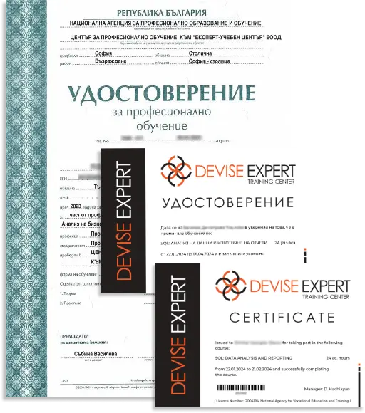 * Devise Expert е лицензиран от Националната агенция за професионално образование и обучение(НАПОО). Издаваните удостоверения са признати в България и валидни в Европейския съюз